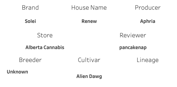 Today we review Aprhria’s Alien Dawg, one of the lowest cost offerings at the Alberta Cannabis store ($8.71 per gram). Prevalent in 2016 and 2017 in the medical markets, this cultivar was offered by 5 licensed producers and sold at a historical average of $9.06 per gram. The price here is 32% lower than the average price per gram in the Alberta Cannabis Store (which is about $11.50 per gram, including all package sizes).