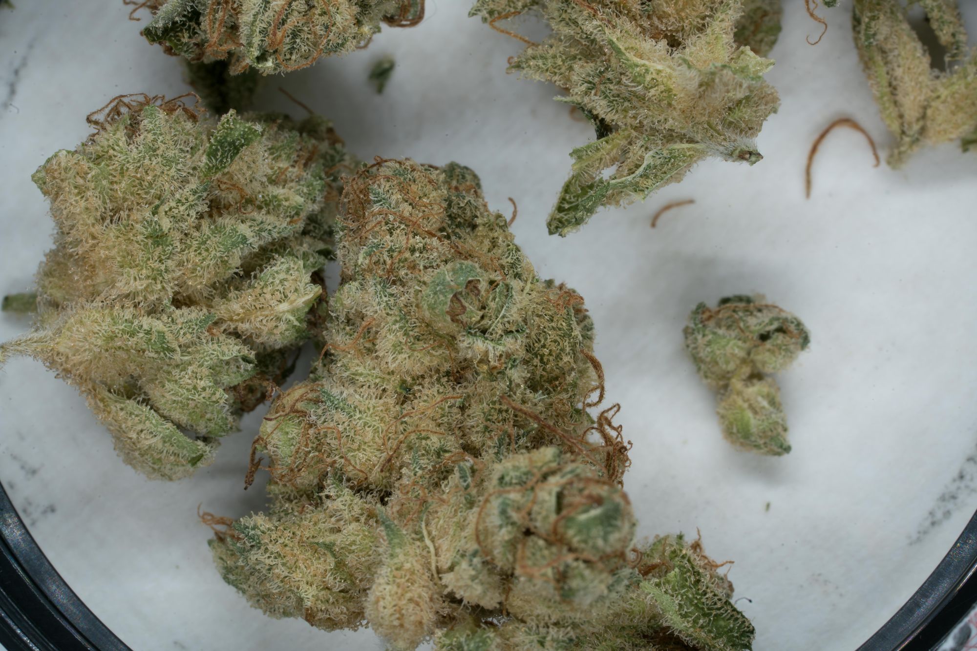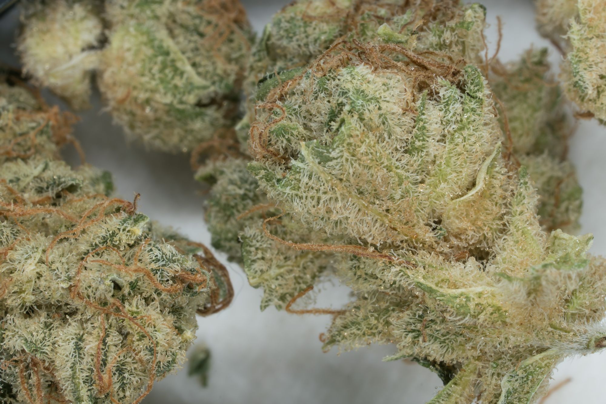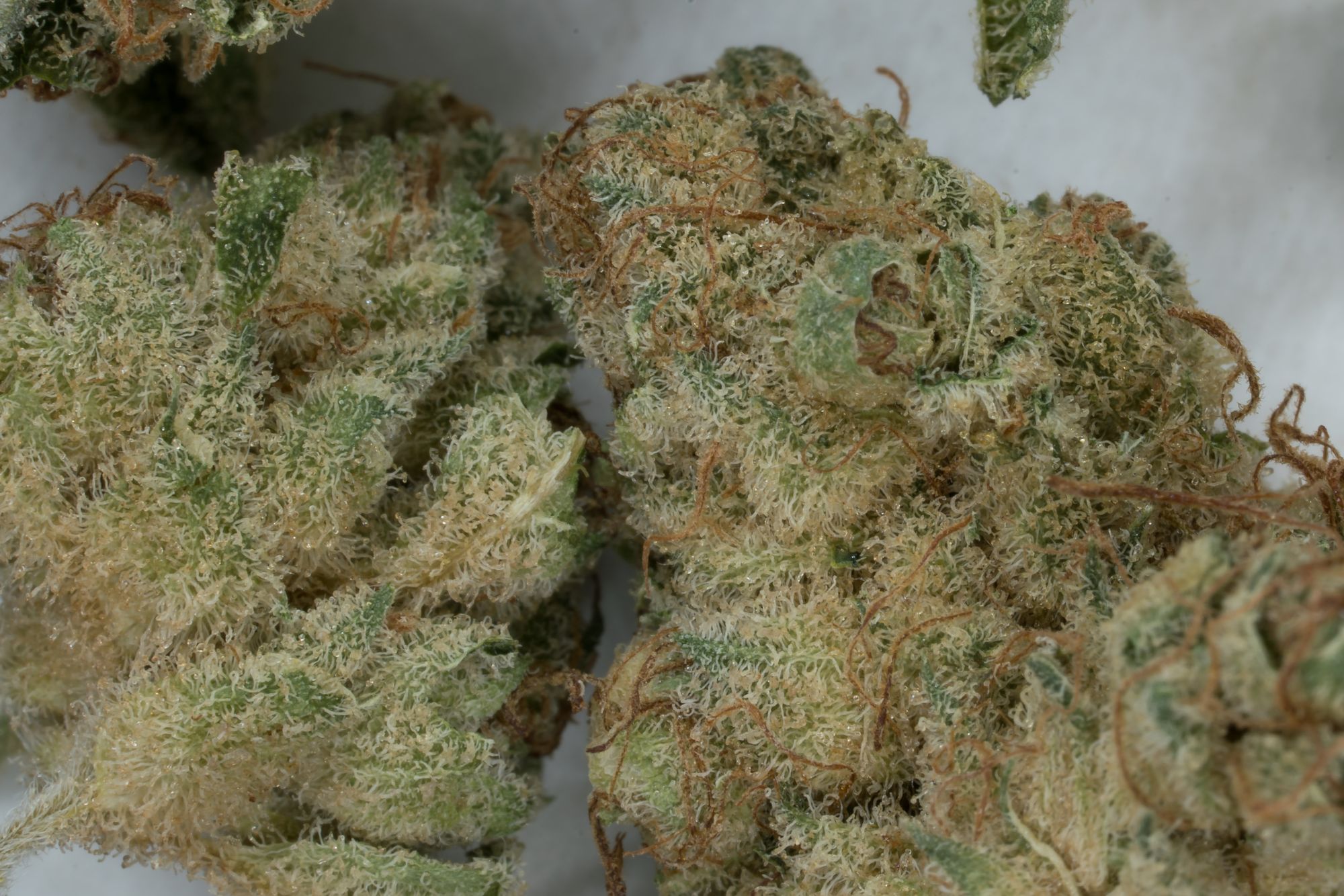 Up close is where this NL Haze really shines. The surface of these buds are coated with trichomes, it looks like they had beige shag carpet installed. Edges of green poke out where the pave of trichomes allow, changing the overall look of these buds towards the lighter green shades.