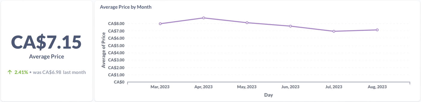 Next we bring in several market measures for this item using data from CannStandard. This data was obtained from public listings for legal cannabis products in Canada. I've provided the data as they were was on August 29 2023. Contact us for more information about our market intel.
