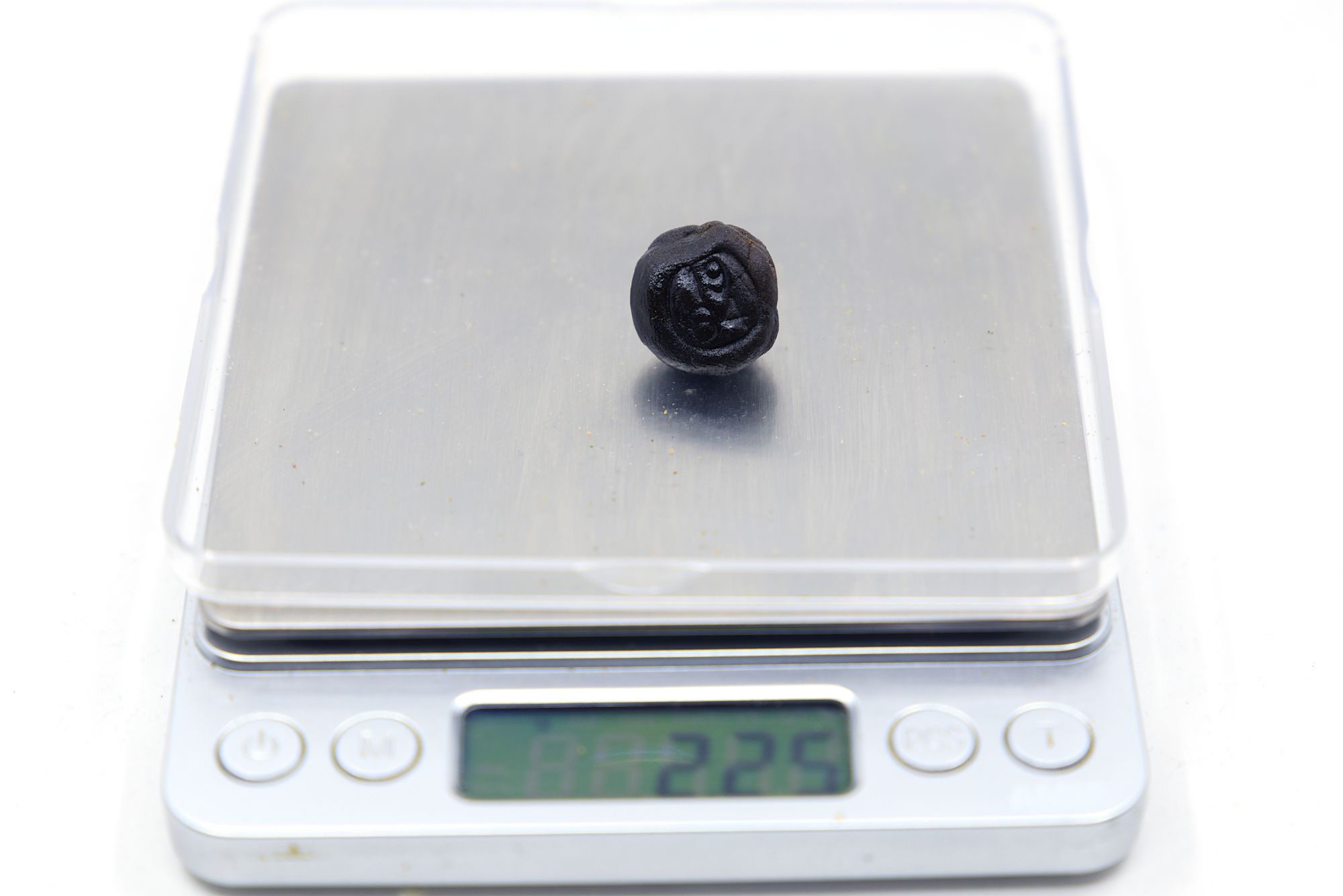 Black and glossy on the outside, rich dark brown on the inside. Very consistent, no visible fibres seen. This looks very good. Points for a nice initial presentation including the “1964” stamp on the upper section of the hash ball.