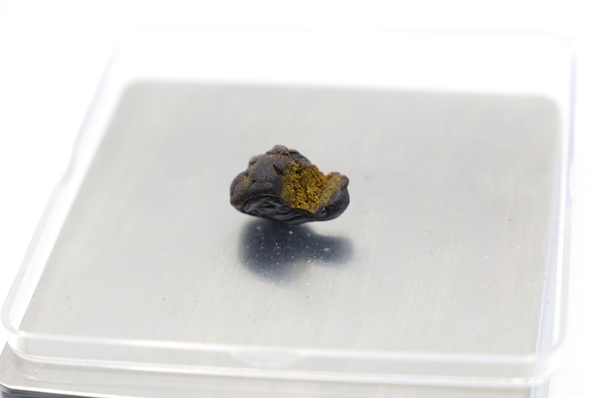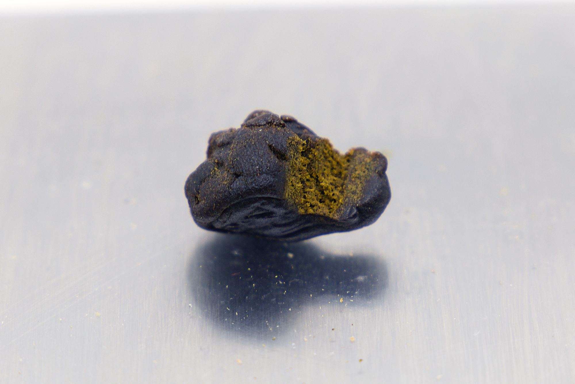 Comes in a glass jar with a child proof lid, which is inside an outer mylar bag. Labelling covers any info you might want to help with a buying decision, though it does look a bit sloppy with stickers just slapped on sloppily. Inside the jar itself the hash is displayed quite nicely, including the brand logo stamped on top. It’s a shame this hash sticks to glass like mad, had to freeze it to get it out at all.