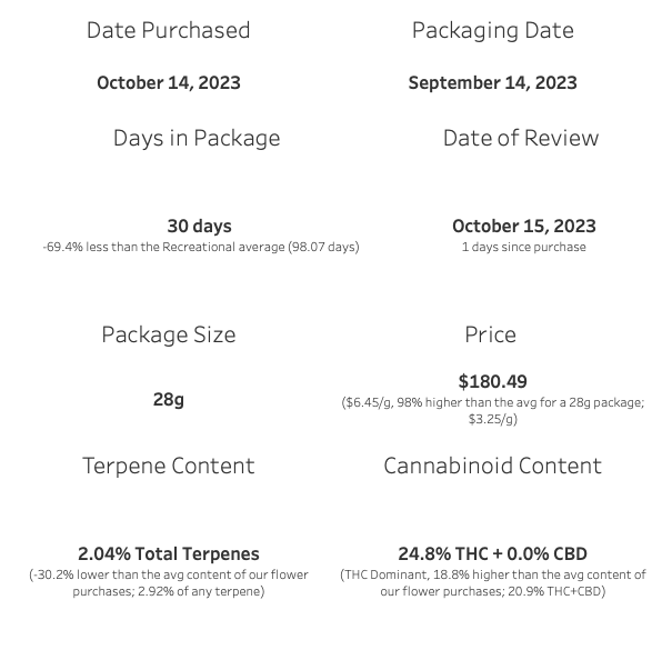 I purchased this product on October 14 2023, and the packaging date was September 14, 2023. This means it spent approximately 30 days in the package, which is about 69% less than the average we observe in the recreational market, typically around 98.07 days.