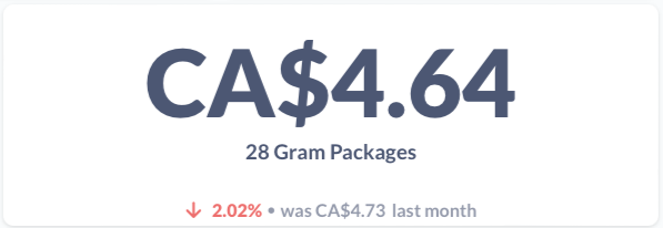 According to the CannStandard data, the average price for a 28g package of cannabis is $132.62 or $4.74 per gram.