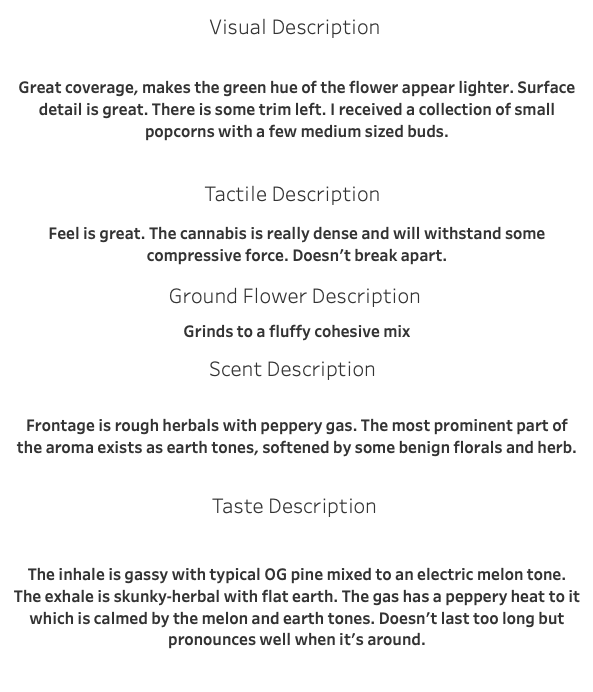 Great trichome coverage and a few flecks of purple are the high points of the visuals. Feel was near perfect. I called the scents about average and the tastes above average. Total points awarded (53/70) is enough for a B but I can tell you now that this has been gone for a while that it also leaves a good impression. I have fond memories of it.