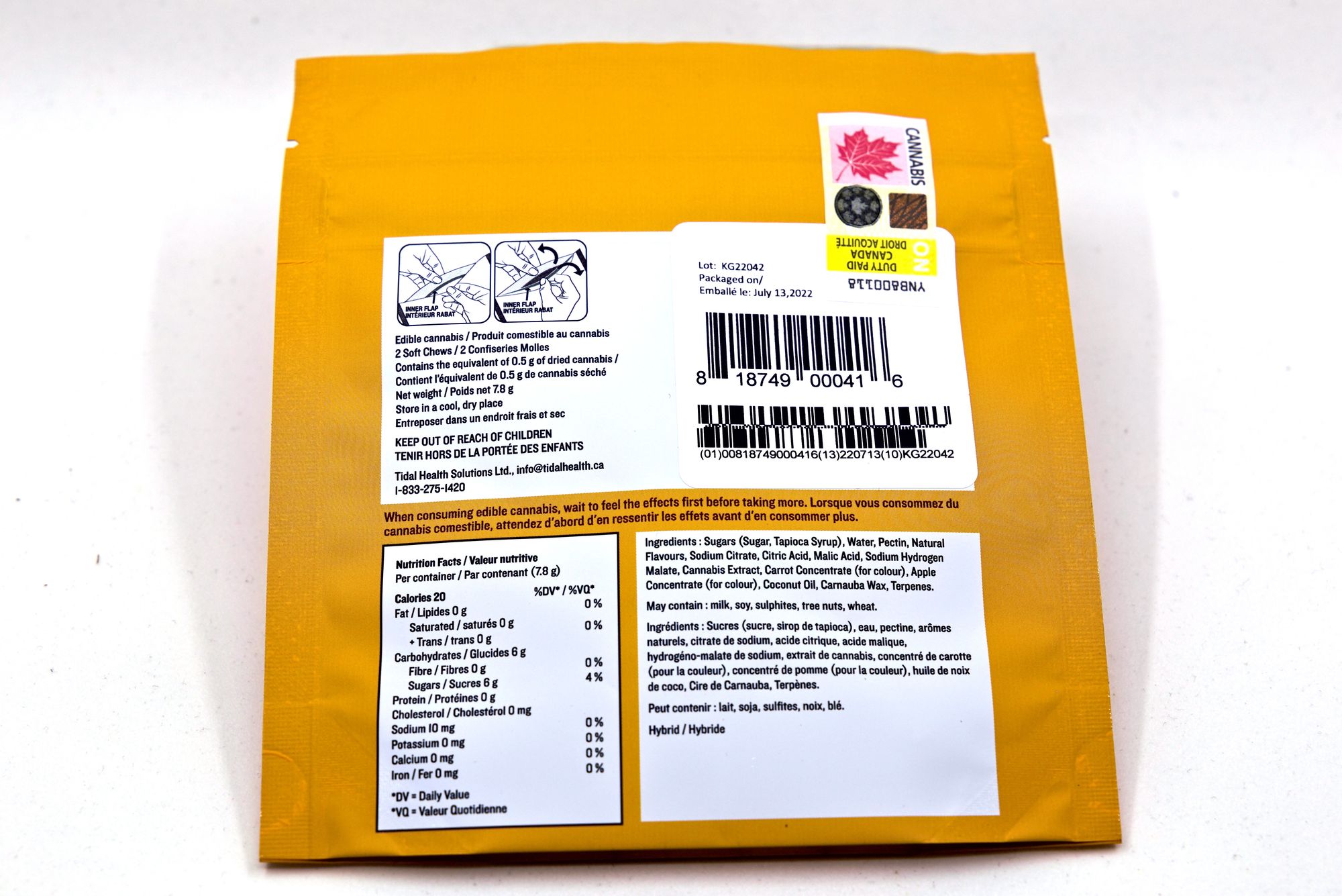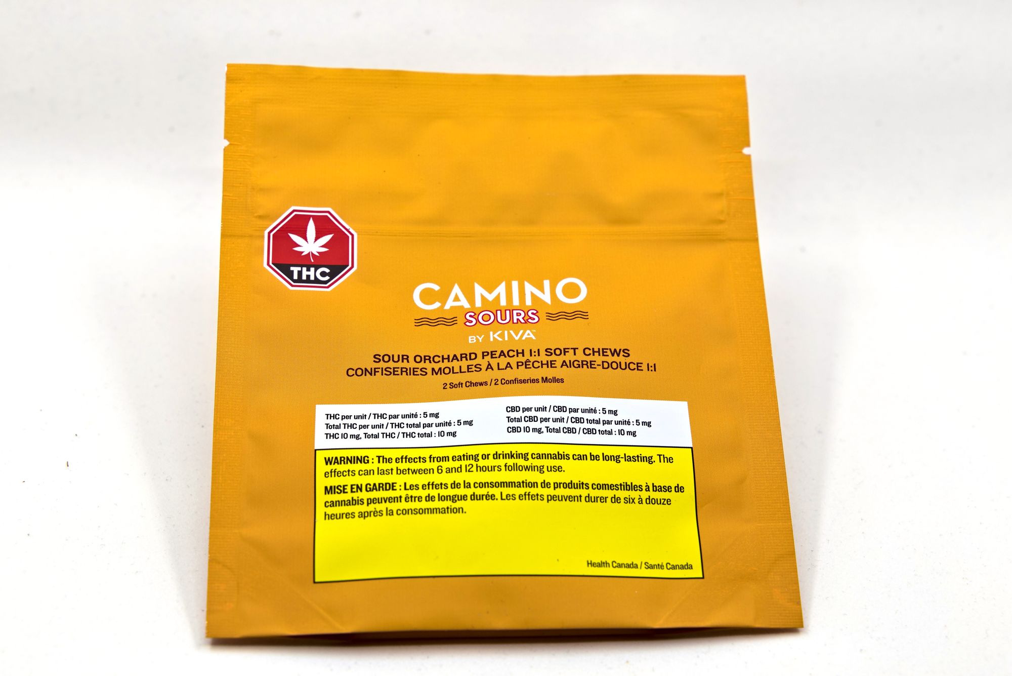The package contains two chews which contain 5mg of THC and 5mg of CBD per piece, with 10mg of both in an entire package.