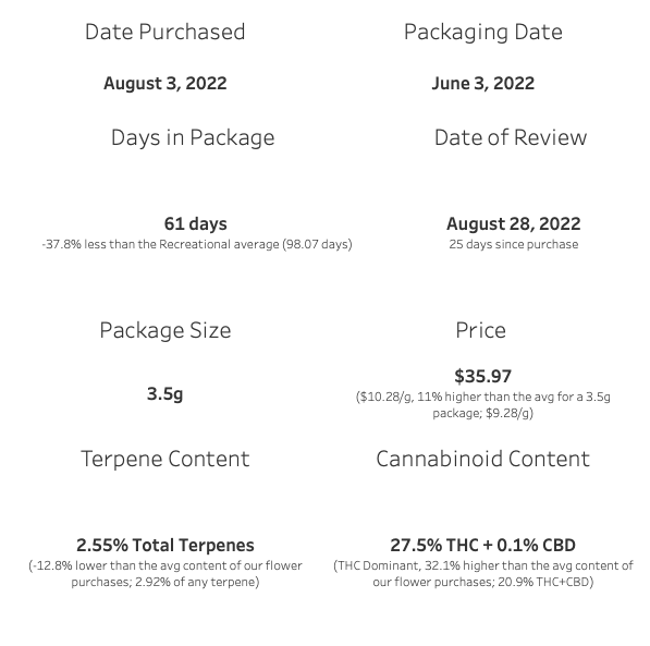 Price is about $10 per gram, or $35 for the eighth. I generally regard this price point on the high side of average, but for Carmel it’s pretty good.