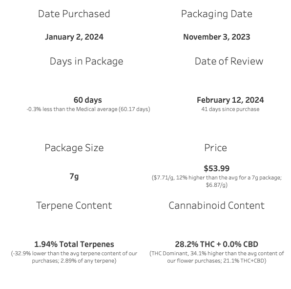 The price for this 7 g package was $53.99, which translates to $7.71 per gram. This is 12% higher than the average price I've paid for a 7 g package, which has been $6.87 per gram.