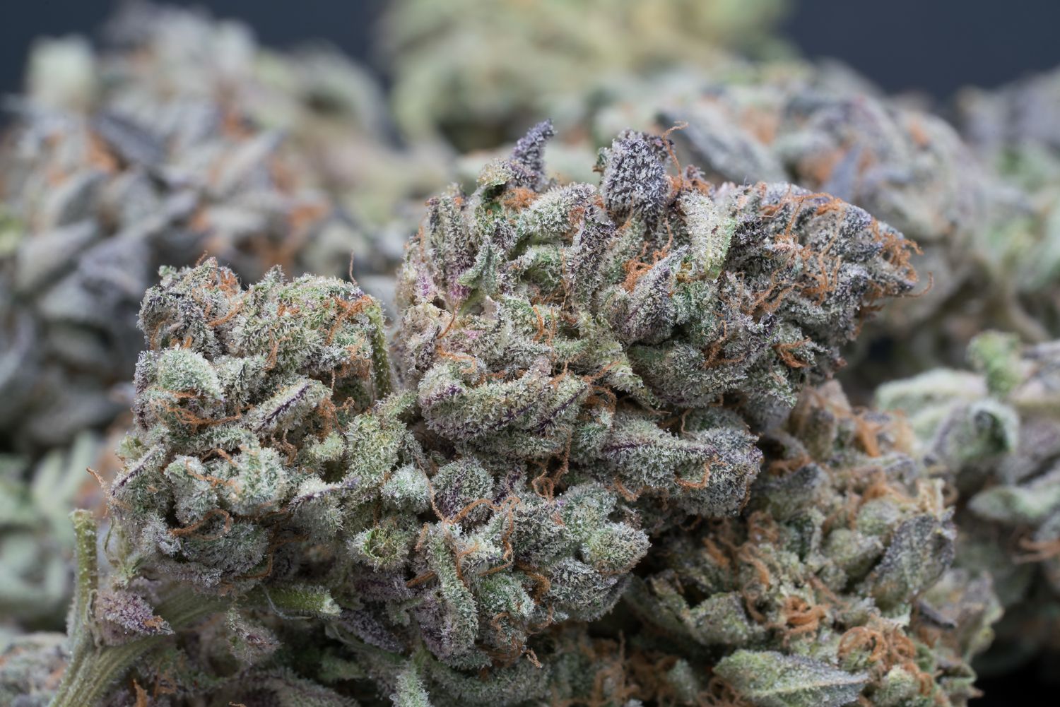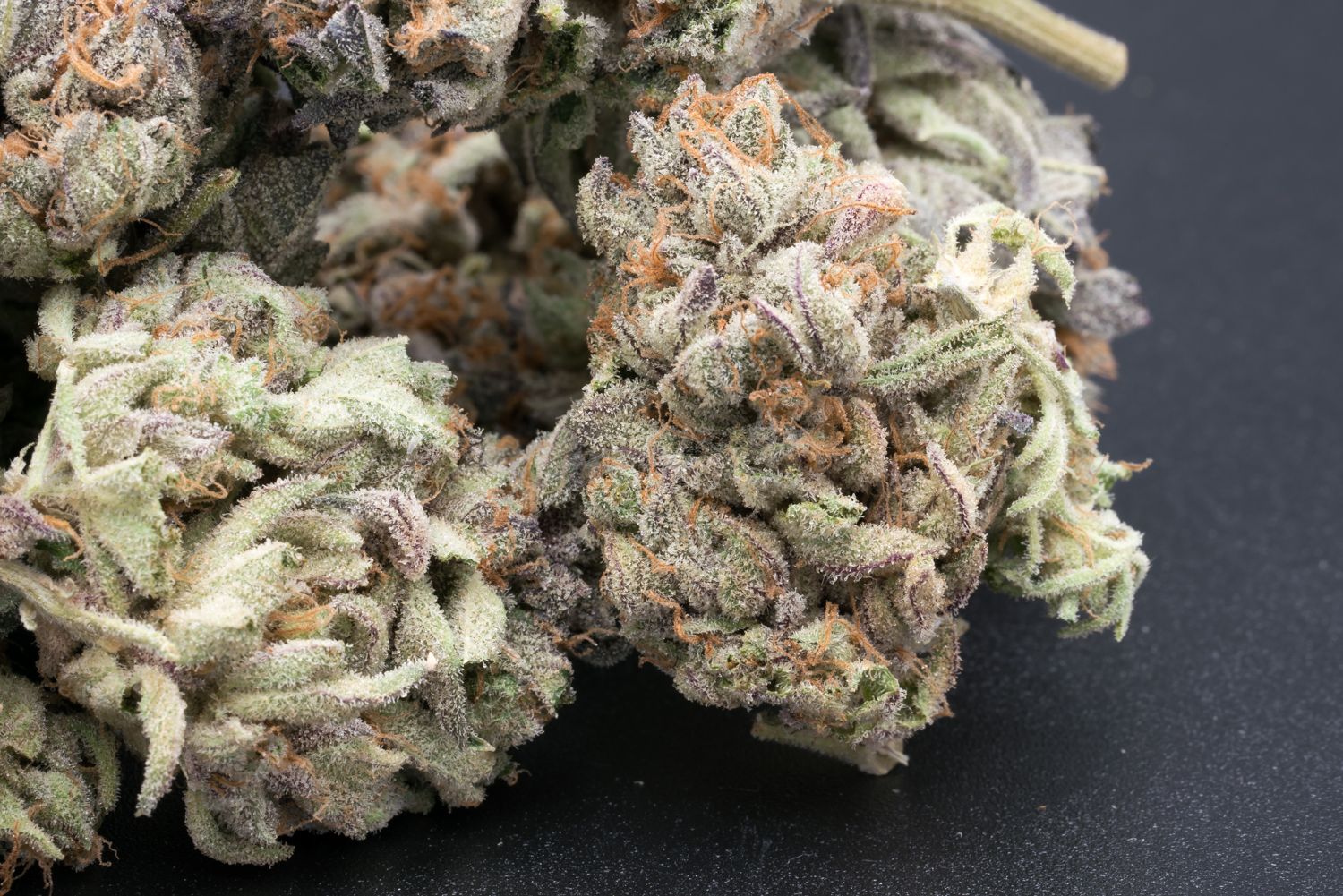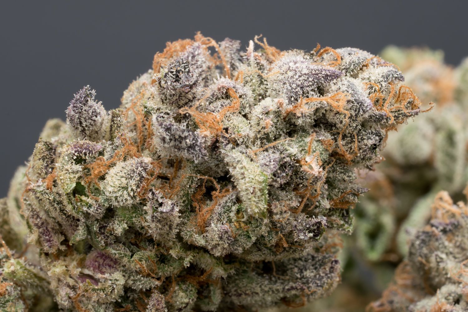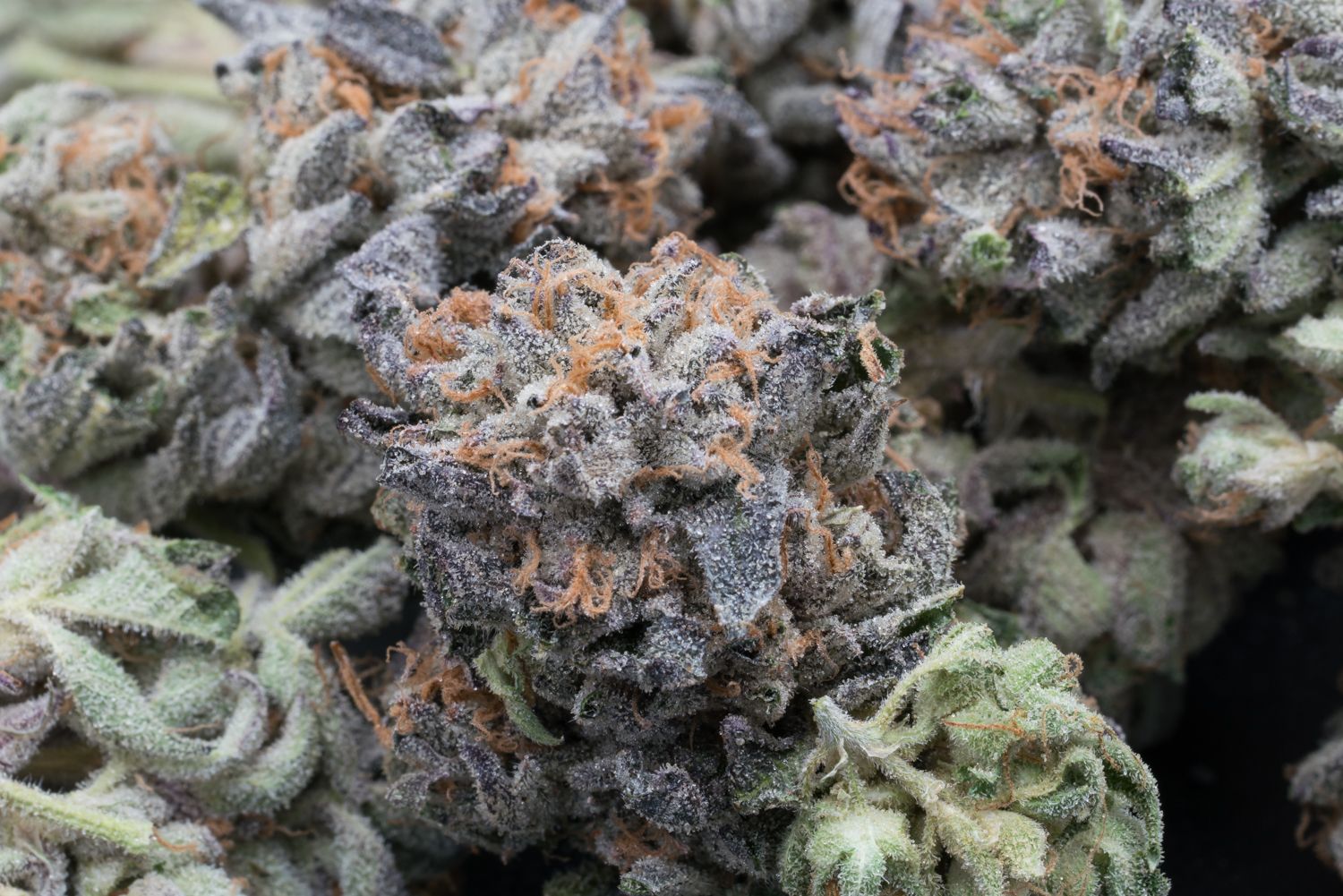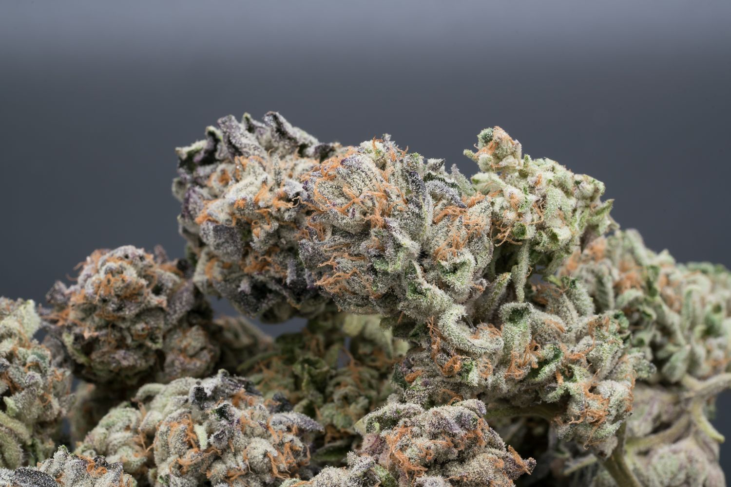Green is a tertiary colour, much of the bud is purple and orange, with a secondary opaque white from the trichome coverage. Shape is more stout than long, width is a little more than thumb size.