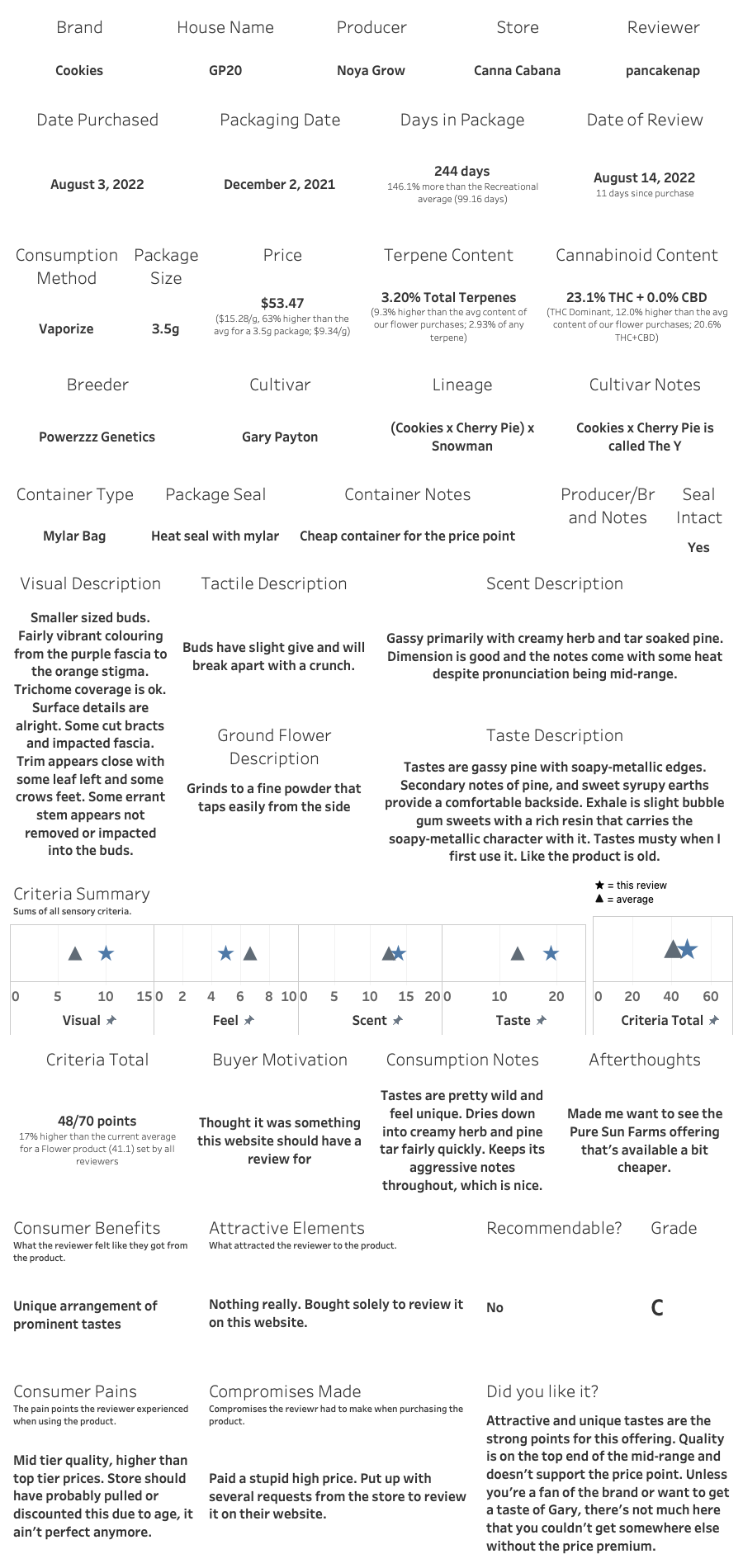 I think there should be an ultra-luxury market for cannabis flower available at top tier, $15+ per gram prices. This just wasn’t it, age was the nail in the coffin. Still, the potential was there. The flavours are pretty unique, but I’m not sure it outshines other brands also offering something unique, for less. By my eye, quality ended up slightly above standard with a few minor and one major points of contention, the latter of which I think the store is more responsible for. But hey? As far as $15 per gram breeder-branded Canadian-produced cannabis goes, to be the best you really only have to beat DNA Genetics by Canopy Growth. Which this did. Anyways, I’d see something by Cookies again, hopefully fresher and a bit cheaper.