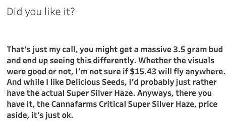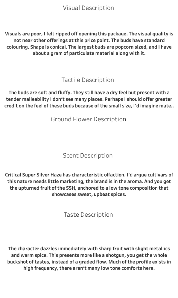 As a consumer, I try to avoid ‘Critical’ cultivars in general. To me, the word critical means big bud, cash crop, and on average, I observe them with less cannabinoid content. But this Critical Super Silver Haze doesn’t follow the trend I’ve just suggested. The buds in my package are disappointingly small, and this offering has above average cannabinoid content.