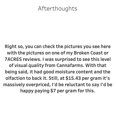 I’m familiar with this producer, I was a CannaFarms’ patient in 2017 and have fond memories of the quality/value of their cannabis.