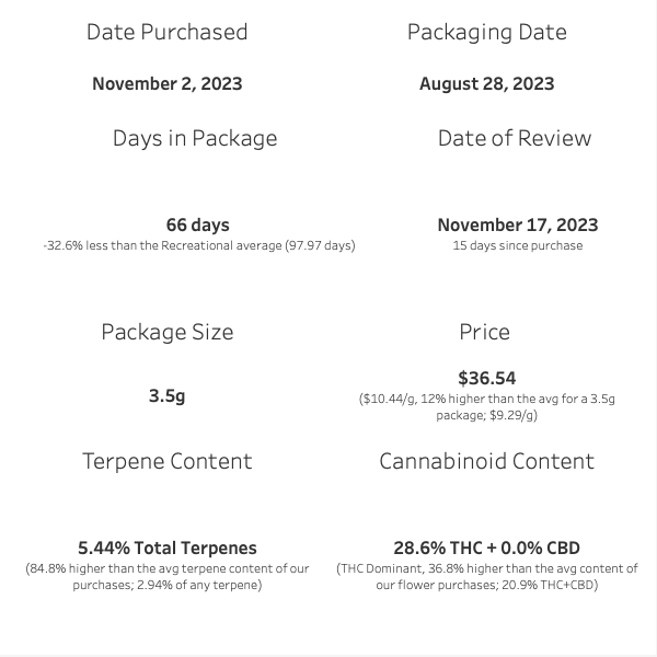 I purchased this product on November 2, 2023, and the packaging date was August 28, 2023. This means it spent approximately 66 days in the package, which is about 32.6% less than the average we observe in the recreational market, typically around 97.97 days.