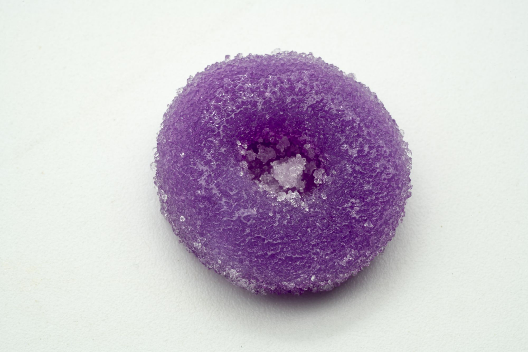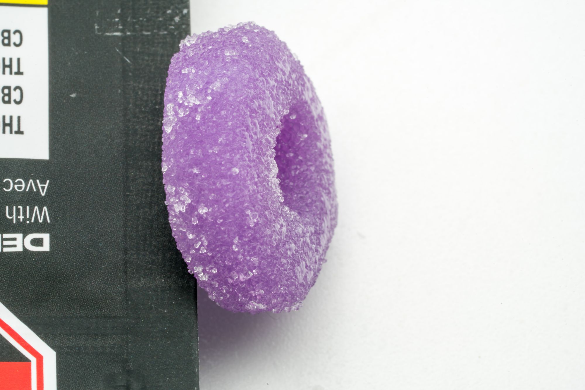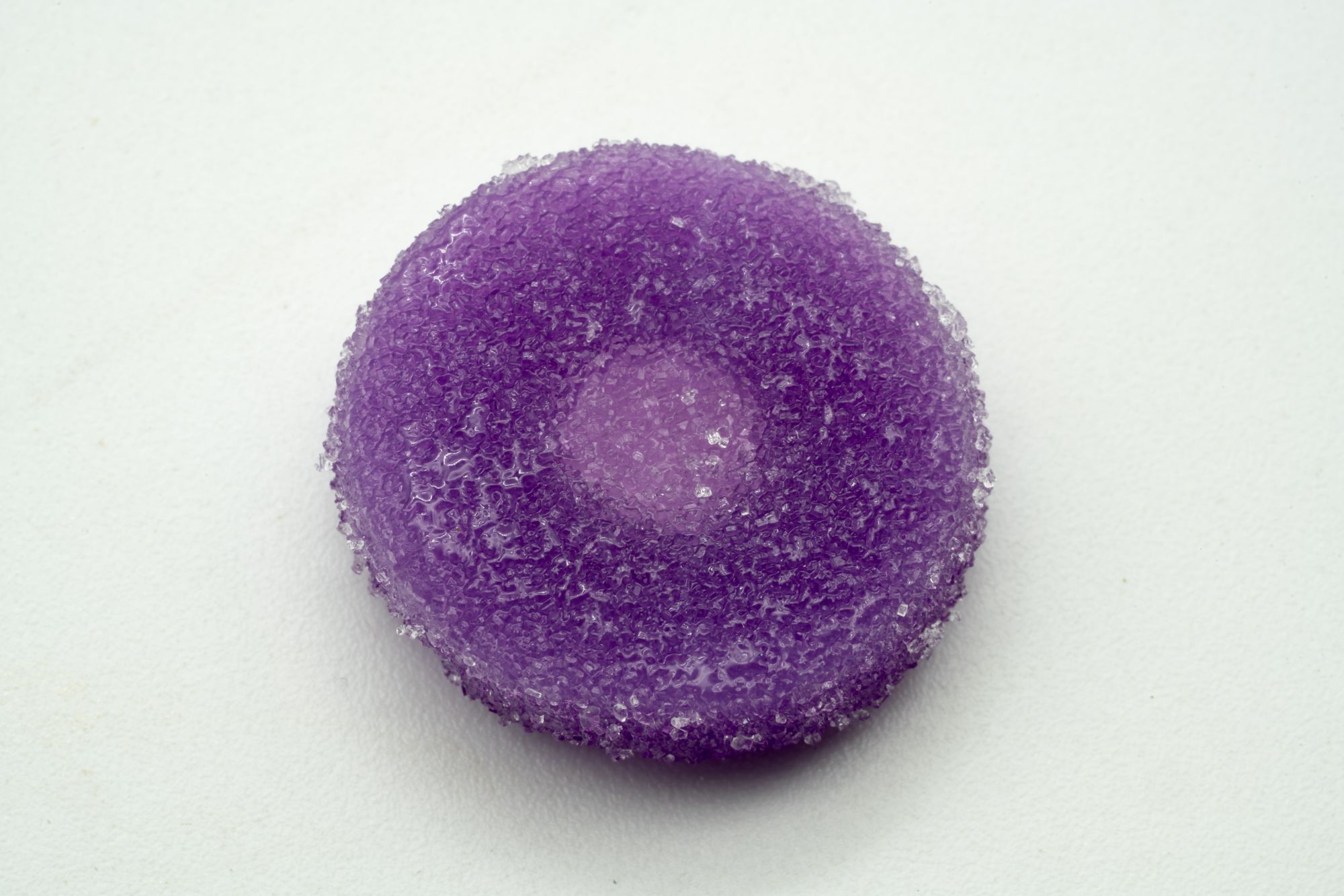 The gummy is covered in some amphipathic liquid. It looks wet, like it was in someone else’s mouth. That’s the most noticeable feature. You also might notice it is purple.