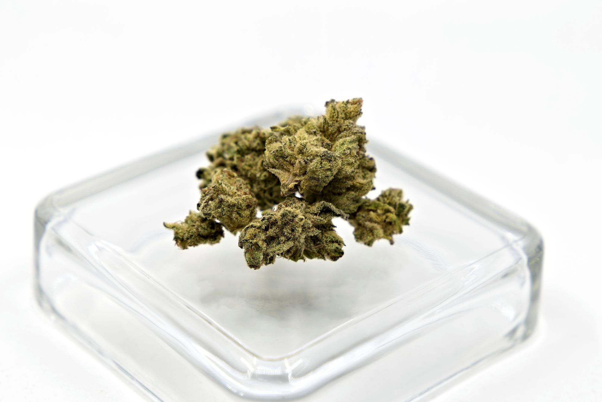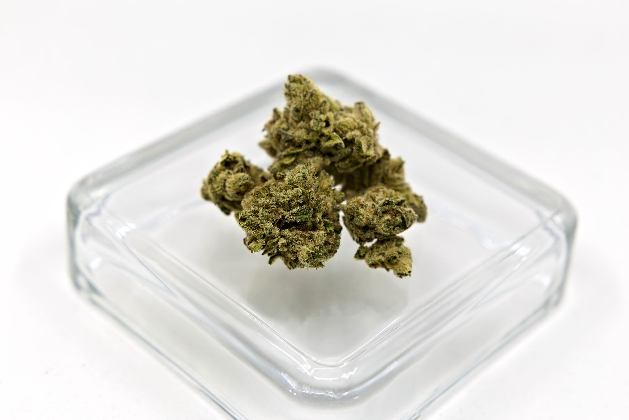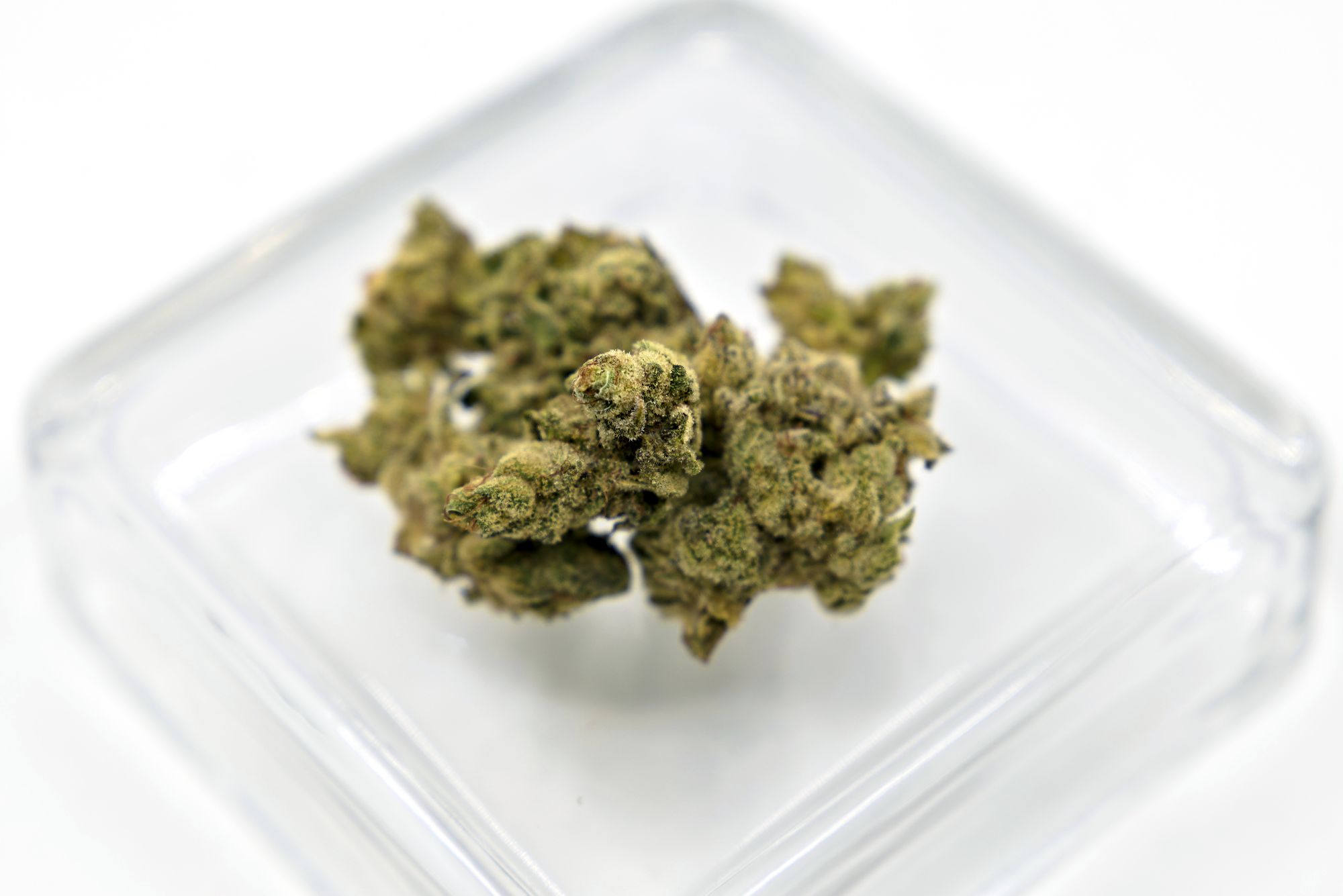 Buds have khaki colouring with some darker patches. Shape is stout, wide at the base and quickly coming to a point. Trim is clearly done by hand and is mildly sloppy. Trichome coverage is good, quite frosty looking. The container had some decent sized buds and a few smaller pieces to round out the weight. Grinds are fluffy and uniform.