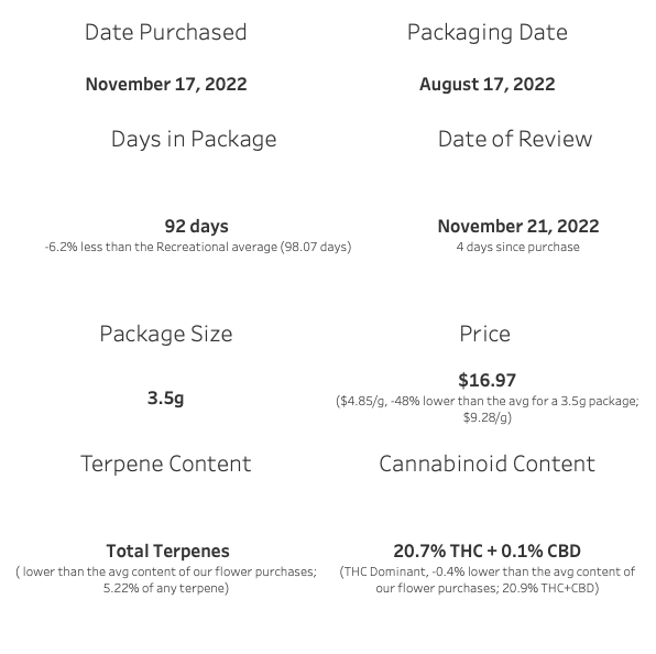 The cannabis was poor quality and mostly devoid of olfactory content. The aromas were not pleasant. As such, I left the majority of this product unused. The price is favourable to the consumer so I’m remised to say that the flower wasn’t in a state where it’s recommendable, or usable.