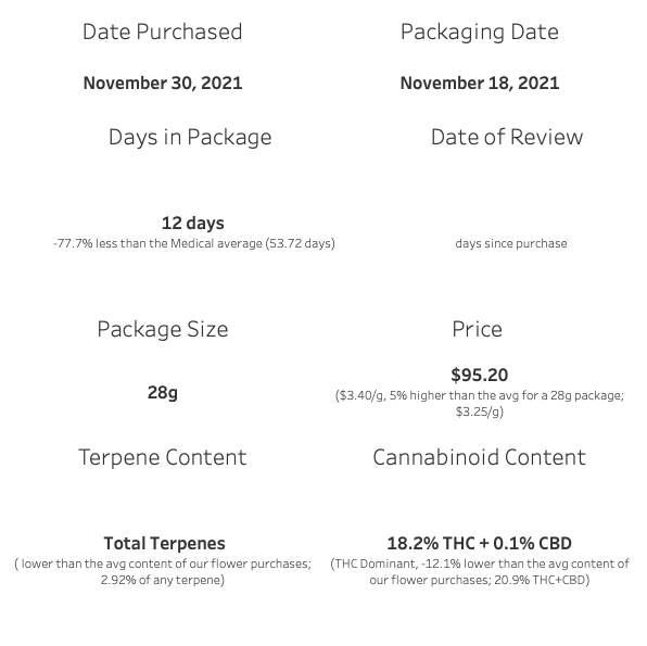 Price on this ounce was $95.20 with Black Friday discount, that’s $3.40 per gram. I felt somewhat positive about the flavour profile but it’d be near impossible for me to make a case for anything near average value for this offering. I feel like there’s potential, and space, for this offering in the market, but its a very poor value in the condition I saw it in, even at the sale price.