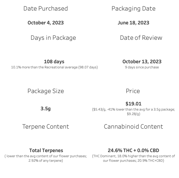I purchased this product on October 4, 2023, and the packaging date was June 18, 2023. This means it spent approximately 108 days in the package, which is about 10% more than the average we observe in the recreational market, typically around 98.07 days.