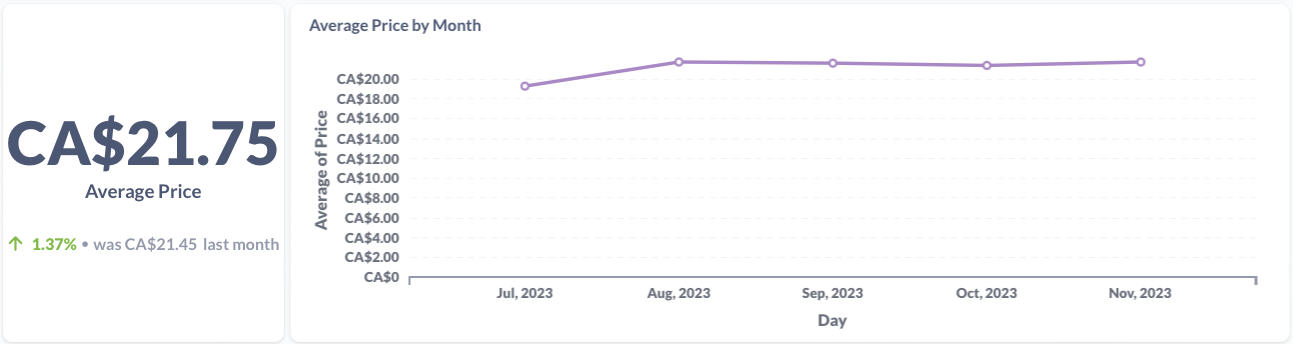 Next we bring in several market measures for this item using data from CannStandard. This data was obtained from public listings for legal cannabis products in Canada. I've provided the data as they were in the last complete month they were available (November 2023).
