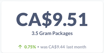 According to the CannStandard data, the average price for a 3.5g package of cannabis in November 2023 is $32.59 or $9.31 per gram.