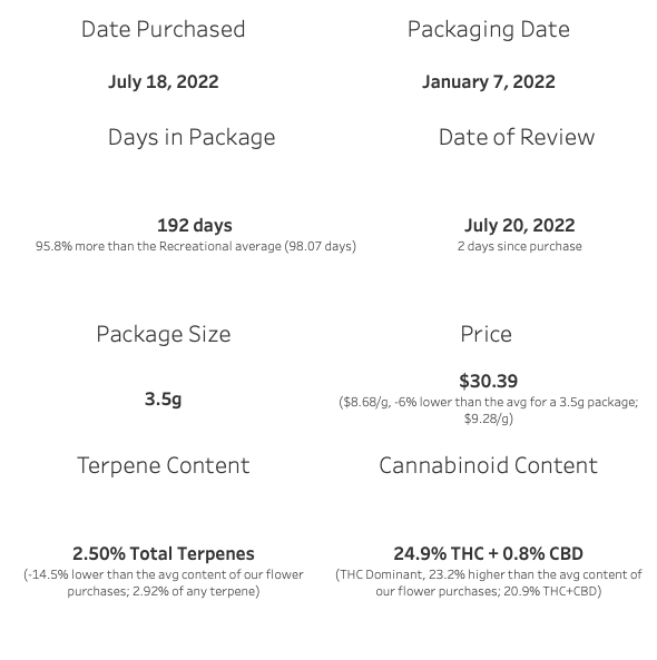 Price was $30.39, or $8.68 per gram. I’d tell you that price point is pretty favourable for what you get with this offering, but I didn’t feel that way personally.