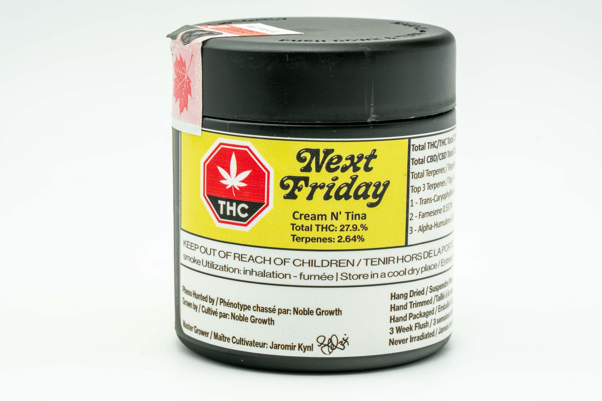 Hey pancakenap here with a 3.5 gram package of Next Friday’s Cream N’ Tina, produced by Noble Growth.