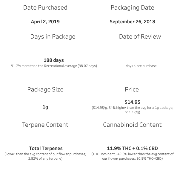 This one is warehouse grown over in Ontario. Packaged September 26 2018 and now we review it, a lengthy 240 days after it was packed.