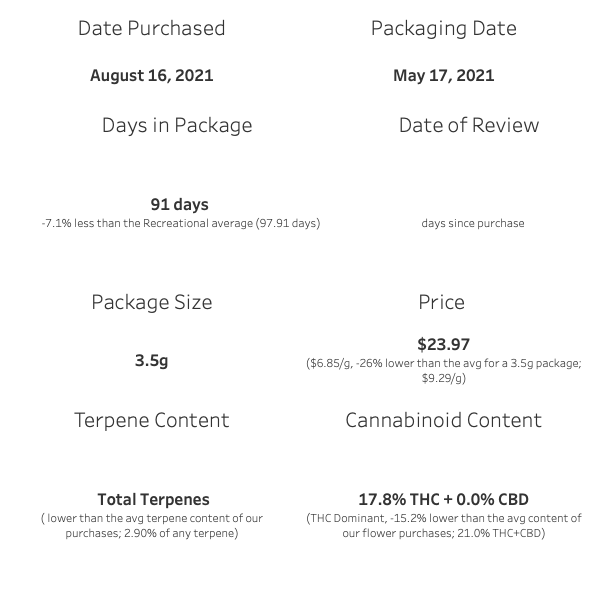 Price is lower than average for the my purchase history in package size, both in general and from the vendor (Value Buds). I’d speculate the cannabinoid content may be a reason why. This producer (Organnicraft) has another offering out in this package size, a Cherry Punch, which is listed above 22% THC, and priced higher at $39.