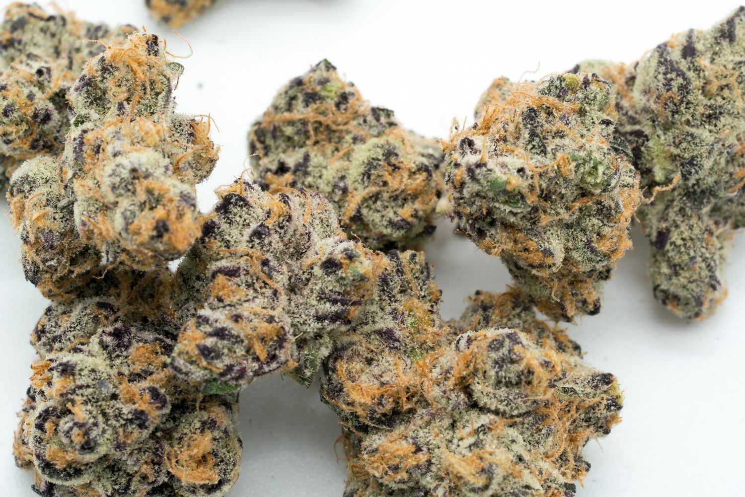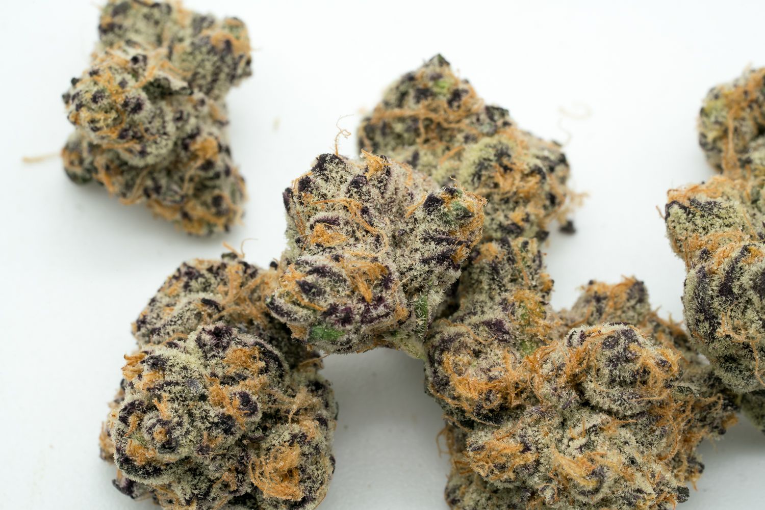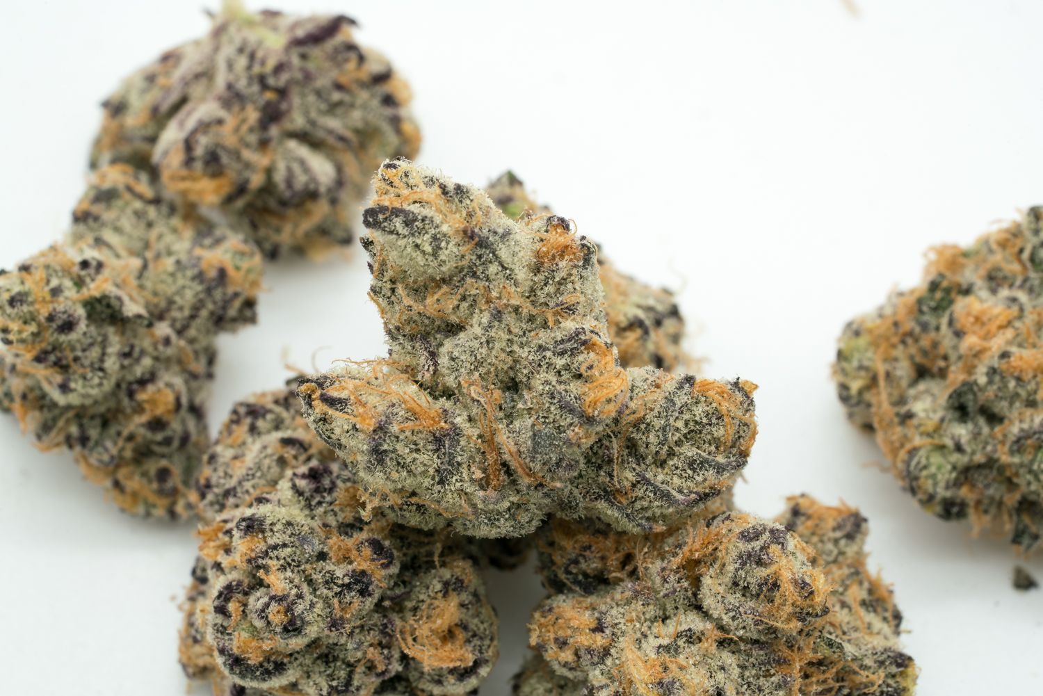 In the surface details this flower is a good model for what you want from dried flower. Trim ain’t perfect, but its good enough to compliment the surface. Every jagged detail has been left intact. The trichomes haven’t been impacted down to the point where they’ve congealed into each other. Some of the buds are smaller, but they maintain this good development. Colouring is purple, although the pictures don’t really do this comment justice.