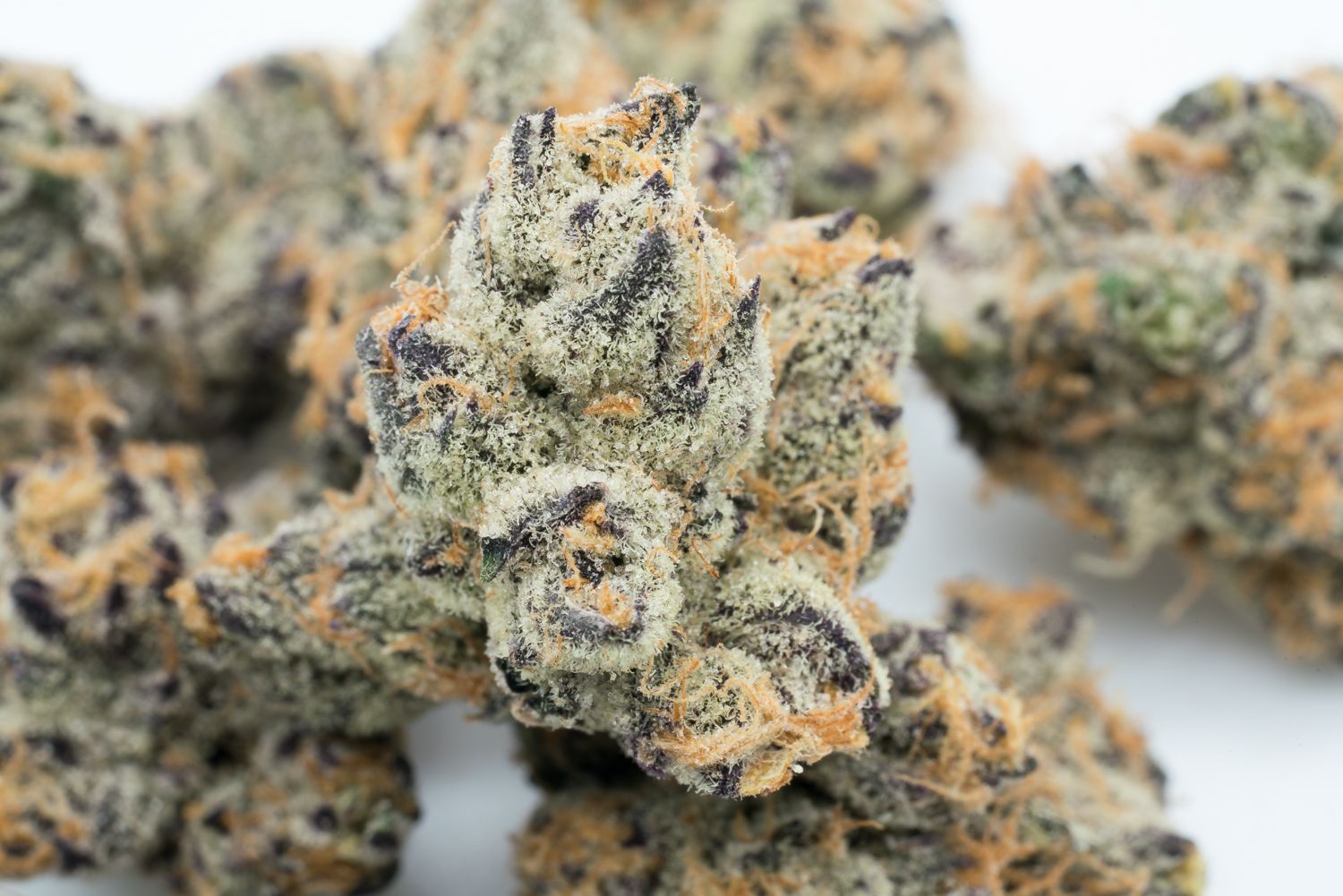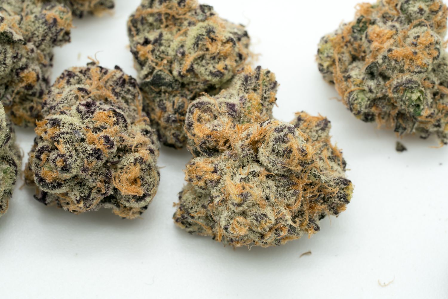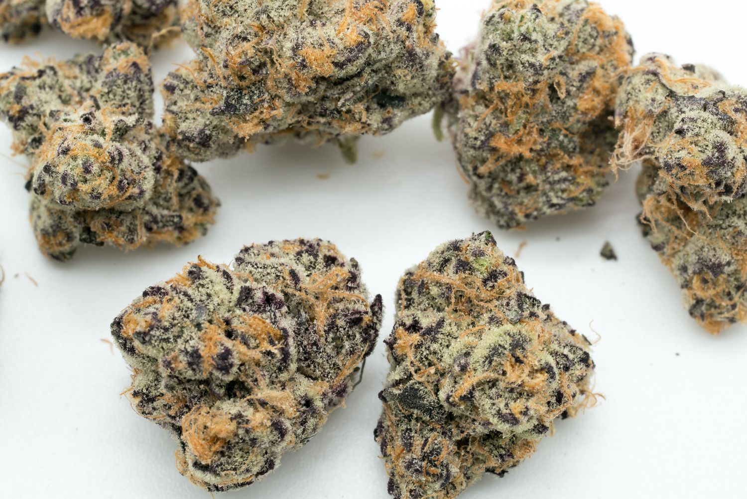 In the surface details this flower is a good model for what you want from dried flower. Trim ain’t perfect, but its good enough to compliment the surface. Every jagged detail has been left intact. The trichomes haven’t been impacted down to the point where they’ve congealed into each other. Some of the buds are smaller, but they maintain this good development. Colouring is purple, although the pictures don’t really do this comment justice.