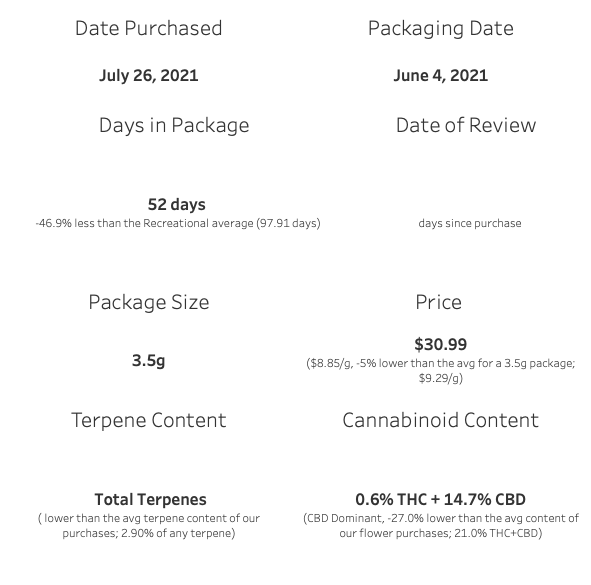 For those seeking citrus tastes, a CBD dominant cultivar, or both; this offering had great quality for a price that I’d relate is pretty fair.