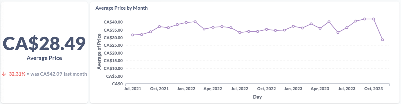 Next we bring in several market measures for this item using data from CannStandard. This data was obtained from public listings for legal cannabis products in Canada. I've provided the data as they were in the last complete month they were available (October 2023).