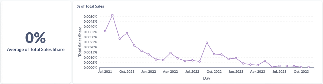 The sum of sales for this item as a percentage of all sales we track. The static average is shown on the left and the monthly average is shown on right.
