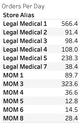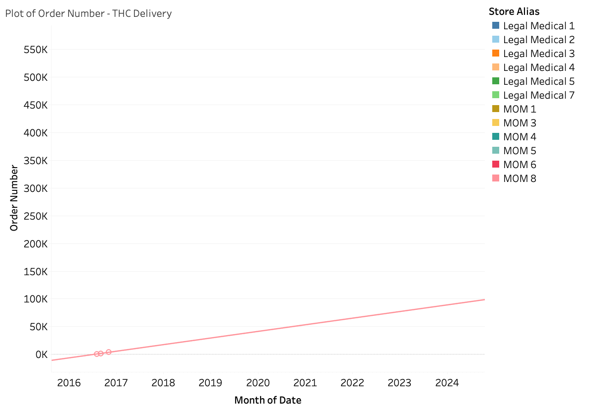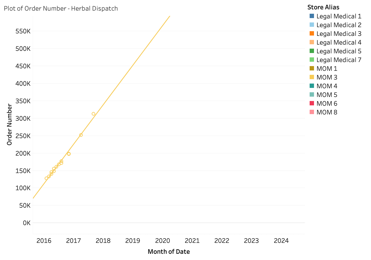 There are 14 order numbers for Herbal Dispatch placed over a 572-day period from 2016 to 2017, prior to the store reemerging as a legal medical store. Based on the change in order numbers and an average order value of $200, we estimate their revenues at nearly $2 million monthly—almost four times higher than the next store in the Legacy MOM category.