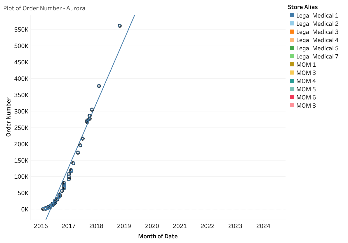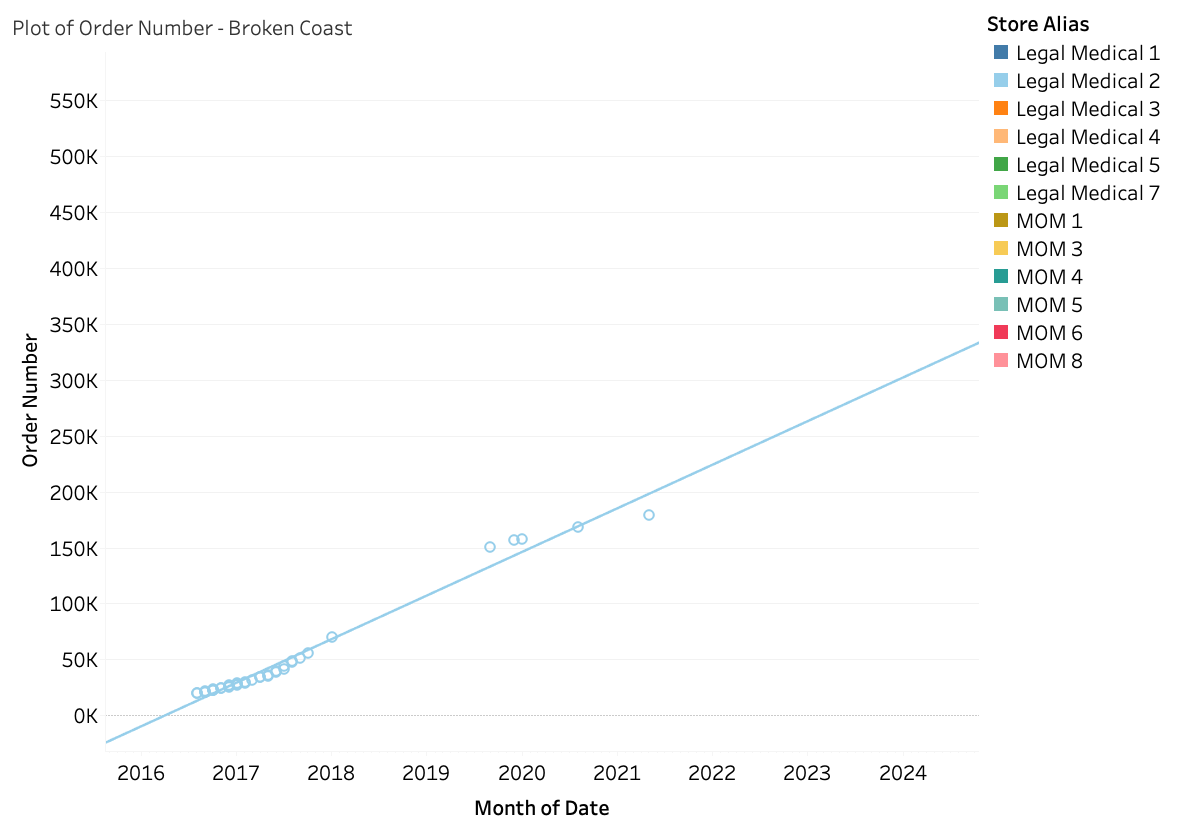 Dates and order numbers for mail order cannabis, legal medical and legacy, were tracked and plotted. This information was used to estimate the number of orders per day and an average order value was applied to estimate monthly revenue (30 day period).