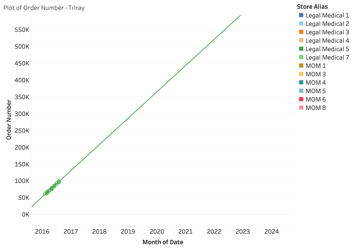 Plotting for Linearity: The order numbers were plotted on a Cartesian plane against the order dates to determine their linearity. Stores where only one purchase was made, those that did not show a linear progression in order numbers, or those where order numbers ran in reverse order were eliminated from the analysis. Three stores were excluded based on these criteria.