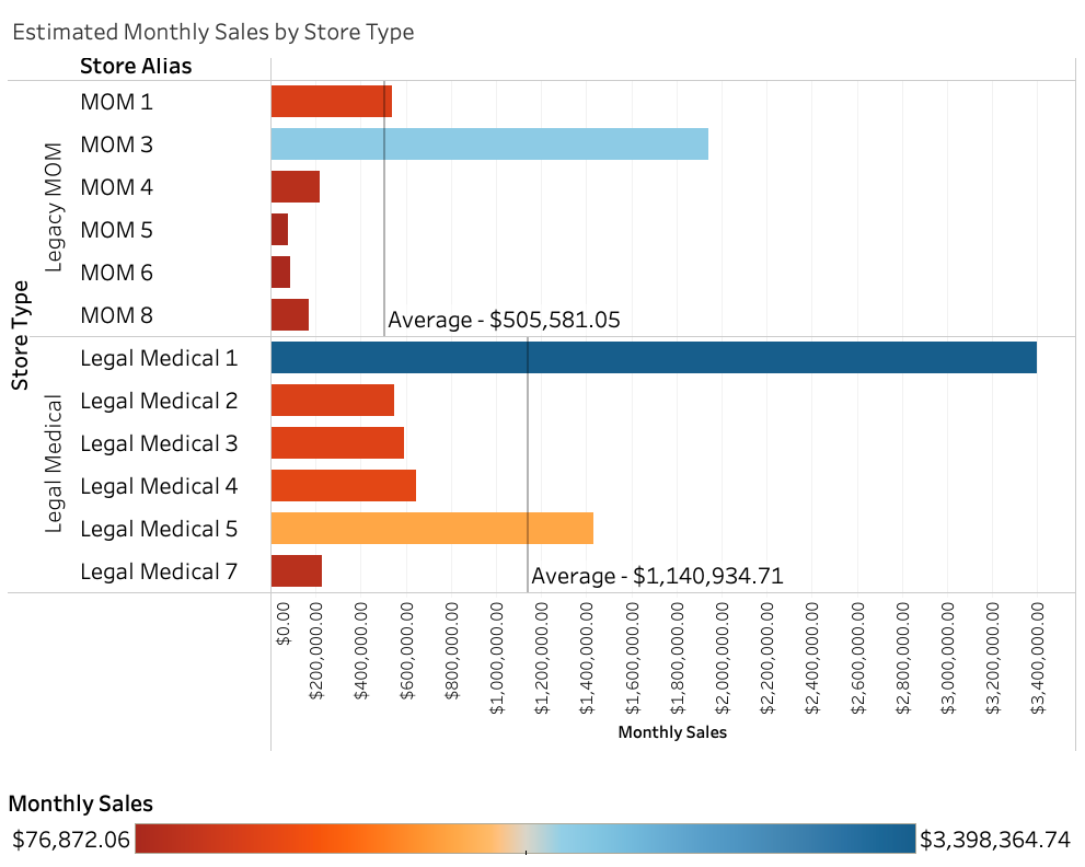 Estimated revenue at Legacy MOM stores ranged from $76k to $1.9M depending on the store and time period. Estimated revenue at Legal Medical stores ranged from $230k to $3.3M.