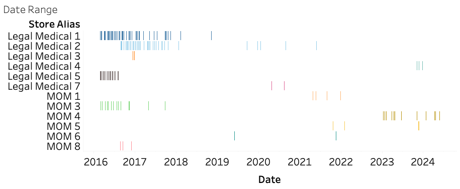 Stores where orders were placed are white-labeled. Instead of the store's name, we're showing them according to store type (legal medical and legacy MOM). We name a few at the end but not any active MOMs or those who have converted to new names.