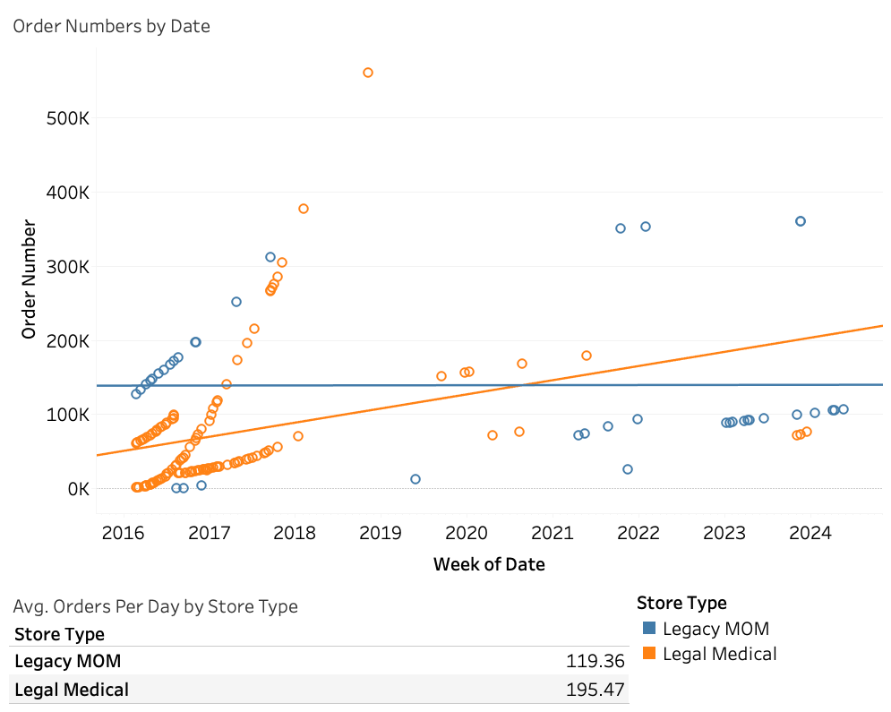 - Legal Medical: Orders show a strong increase from 2016 onwards. We're tracking 195.47 orders per day based on the order data.