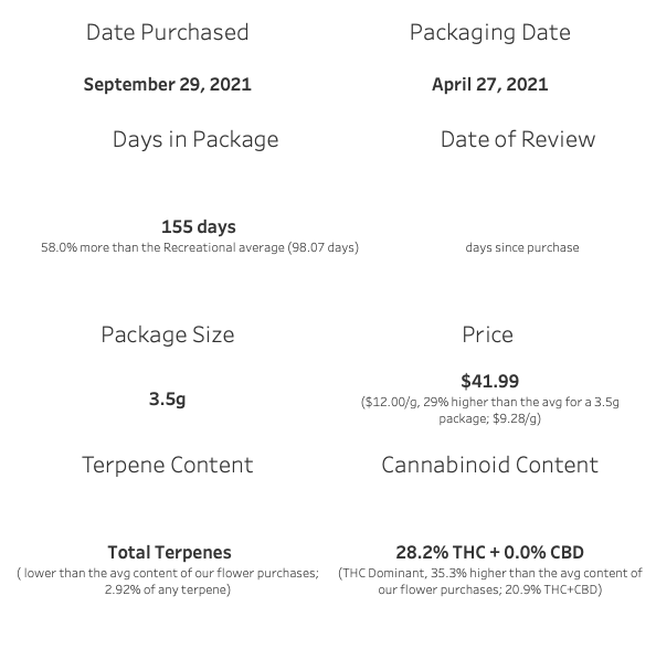 However, I didn’t feel great paying $12 per gram for larfy lowers. This offering was previously priced in the $60 range, and at that price point I’d relate consumers shouldn’t have to pick over their buds to determine what is larf and what is a larger cola, broken up.