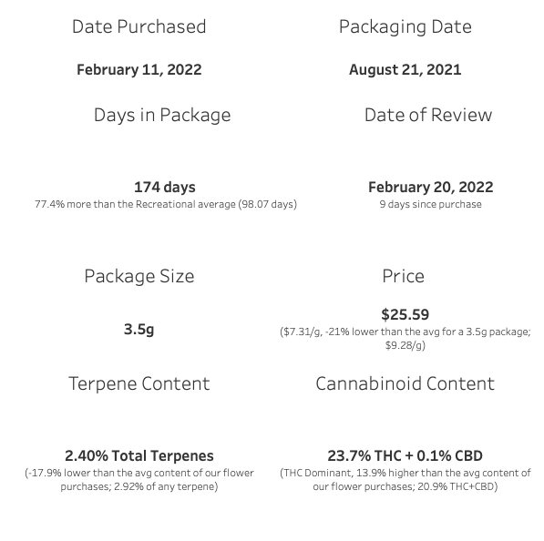 Price for this offering ($25.99) was about 20% lower than the average for a 3.5g package in Alberta in 2022 ($31.99). It’s also 27% lower than the average set by all purchases made by contributors ($35.03).