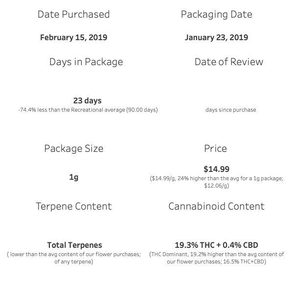 The stats on this one are geared towards someone who might appreciate cannabis at face value. Silly questions like; what cultivar is this? how much mycrene does it make? and why is it $14.95 per gram? have no appropriate answer. And we proceed into the review having gained this acceptance.