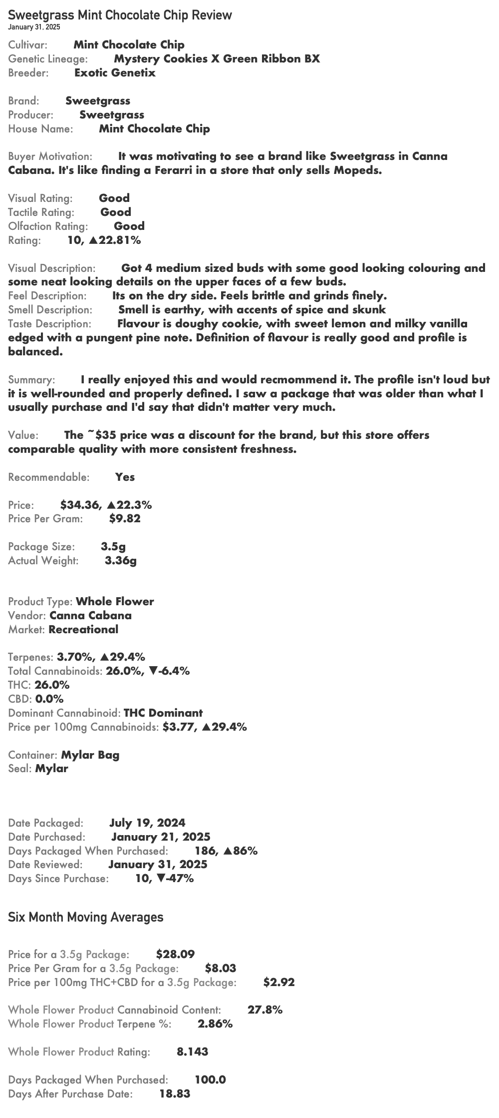 Thanks for joining me today. Checking out Mint Chocolate Chip from Sweetgrass, purchased at Canna Cabana. This offering, bred by Exotic Genetix, has a genetic lineage of Mystery Cookies x Green Ribbon BX and was sold under the Sweetgrass brand. It was refreshing to see a premium brand like Sweetgrass featured in a store predominantly known for budget offerings.