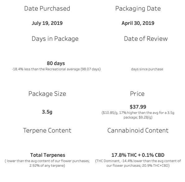 Also, this is our first review of a product purchased at Lake City Cannabis in Chestermere, Alberta. This offering was purchased at their weekly sale, so I received a 16% discount on this product over the price on Alberta’s provincial website.